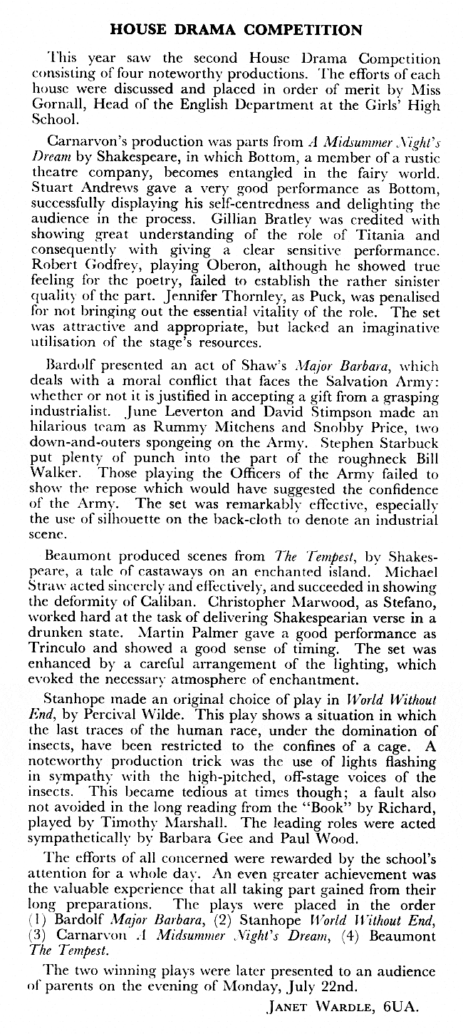 The school house Drama competitions were a regular summer term fixture, and the winners were performed on a later evening for parents. Some were also presented as part of inter-School events. This is a report on the 1961 season.
