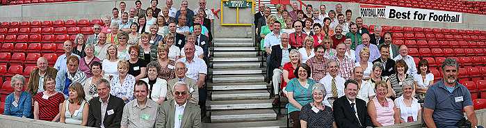 As we always try to do on these occasions, when lunch was over we got everyone together for a group photo. This time we thought a good setting would be the Forest grounds themselves and we arranged everyone on the conveniently handy seating (are they still called 'stands'?). Unfortunately the pitch itself wasn't convenient after all, since it had just been seeded and I wasn't allowed to step far enough onto it to place my tripod. So we had to do the picture in three separate shots, and everyone co-operated very patiently indeed. A certain amount of electronic needlework later allowed me to merge them into one shot, and here it is. You can see a much larger image in the pop-up window by clicking on the image itself. The image will take longer than usual to appear the first time you download it, especially if you are using a dial-up connection, so please be patient. Maximise the window to fill your screen: it won't fit widthways, so use the scroll bar. Close the window before you leave. |